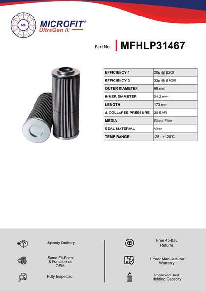 Genuine MICROFIT® UltraGen III MFHLP31467 Pressure Filter. Engineered and manufactured in Great Britain the MFHLP31467 is designed to meet or exceed the quality and performance of OEM quality standards, ensuring superior filtration performance and the longest possible filter life.Building on over 50 years of filtration expertise, the UltraGen III series is the third generation of MICROFIT® filter media, delivering exceptional efficiency and reliability.