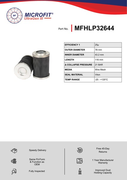 Genuine MICROFIT® UltraGen III MFHLP32644 Pressure Filter. Engineered and manufactured in Great Britain the MFHLP32644 is designed to meet or exceed the quality and performance of OEM quality standards, ensuring superior filtration performance and the longest possible filter life.