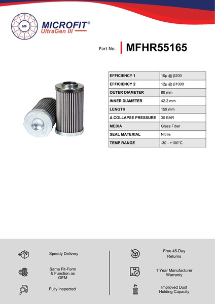 Genuine MICROFIT® UltraGen III MFHR55165 Return Filter. Engineered and manufactured in Great Britain the MFHR55165 is designed to meet or exceed the quality and performance of OEM quality standards, ensuring superior filtration performance and the longest possible filter life.Building on over 50 years of filtration expertise, the UltraGen III series is the third generation of MICROFIT® filter media, delivering exceptional efficiency and reliability.